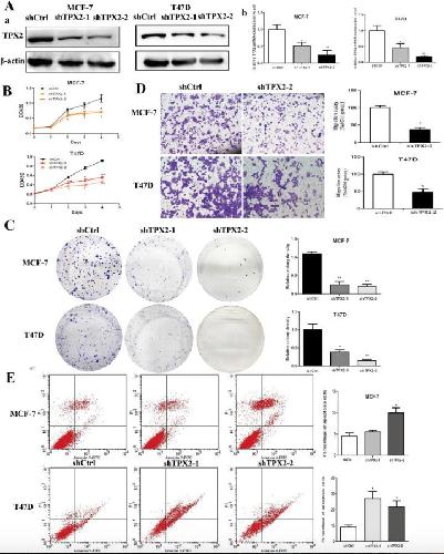 Fig. 2. TPX2 inhibition suppressed proliferation and induced apoptosis of breast cancer cells. A. TPX2 knockdown efficiency was determined by Western blot and qRT-PCR analysis in MCF-7 and T47D cells; B. Suppression of TPX2 significantly reduced the proliferation of MCF-7 and T47D cells; C. MCF-7 and T47D cells were transfected with shCtrl and shTPX2-1/2 for the clonogenic assay. Representative data and quantitative results are shown; D. Representative images showed the migration ability of MCF-7 and T47D cells transfected with shTPX2-2 or shCtrl (original magnification Ã200) and quantitative results were shown; E. The percentage of apoptosis were measured by flow cytometry in the transduced MCF-7 and T47D cells. All experiments were carried out in triplicate. Data are shown as mean ± SEM, *P < 0.05, **P < 0.01.