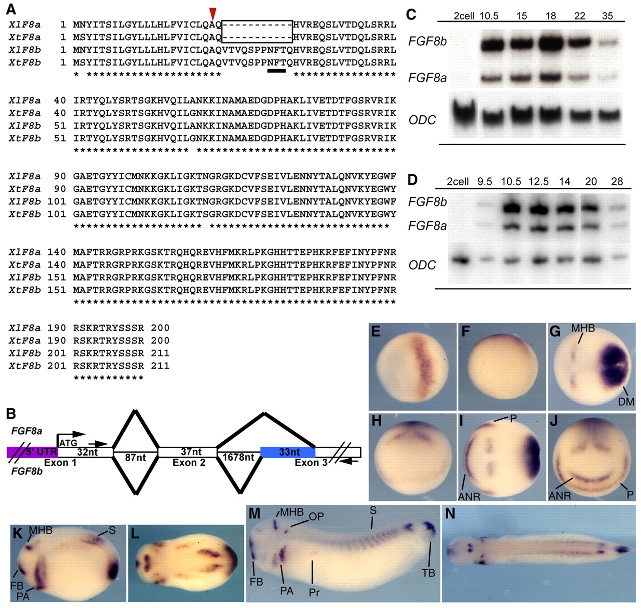 Fig. 1. FGF8 expression. (A) Alignment of Xenopus FGF8a and FGF8b amino acid sequences (ClustalW). The signal sequence cleavage position is predicted to be after the 22nd amino acid residue (alanine) (arrowhead), determined by using the SignalP 3.0 program (Bendtsen et al., 2004). Underlining indicates the N-linked glycosylation site (NFT) (reviewed by Dempski and Imperiali, 2002). (B) Xenopus FGF8a and FGF8b result from alternative splicing of the third exon; FGF8a uses an alternative splice acceptor (3â²) site. The ATG indicates the translational start; black arrows indicate primers used for PCR amplification in the RTPCR panel in C,D. (C) X. laevis and (D) X. tropicalis RTPCR analysis of whole embryos using primers to amplify both FGF8a and FGF8b simultaneously. The FGF8a product is 253 bp; FGF8b is 286 bp. (E-N) In situ hybridization profile for FGF8 in X. tropicalis at the indicated stages. (E,G,I,L,N) Dorsal views with anterior towards the left; (F) a blastorporal view; (H,J) frontal views, dorsal upwards; (K,M) lateral views, anterior towards the left. FGF8 is expressed circumferentially around the blastopore (E,F) but is restricted to the dorsal posterior mesoderm as gastrulation proceeds; expression in the posterior mesoderm strengthens during neurulation and MHB expression begins (G,H). DM, dorsal mesoderm; MHB, midbrain-hindbrain boundary; ANR, anterior neural ridge; P, placode region; FB, forebrain; PA, pharyngeal arches; S, somite; OV, otic vesicle; Pr, pronephric anlage; TB, tail bud. |