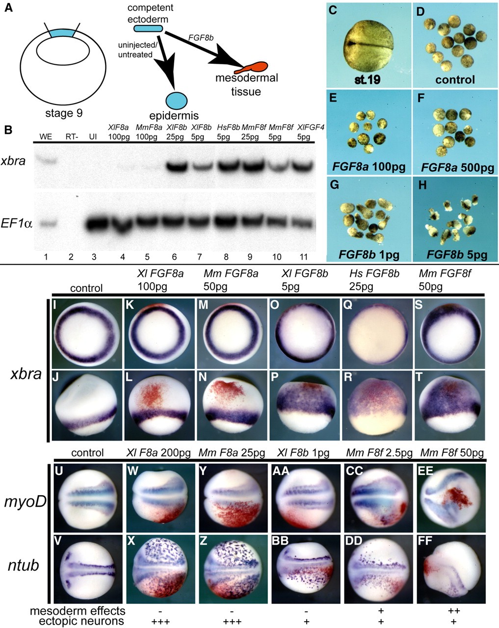 Fig. 2. FGF8b is a robust mesoderm inducer. (A) Diagram of explant assay. (B) RT-PCR analysis of explants injected as indicated at the one-cell stage, excised at stage 9 and cultured to stage 11; EF1α was used as a loading control. Lane 1, whole embryo (WE) positive control; lane 2 negative control minus reverse transcriptase (RT-); lane 3, uninjected explant lane. FGF8b and FGF8f robustly induce xbra expression (lanes 6-10). (C-H) Animal caps injected as indicated and cultured to stage 19. (I-T) Overexpression of Xenopus FGF8b expands xbra in whole embryos. Embryos were injected with mRNA, as indicated, into the marginal zone of one cell at the two-cell stage and cultured until stage 10.5. Embryos in the top row are shown from blastoporal views; the bottom row of images show the same embryos as the respective one above but from a lateral view with the blastopore down.β -galactosidase mRNA was injected as a lineage tracer and detected using Red-Gal substrate. (I,J) Control uninjected embryos. Neither (K,L) XlFGF8a (15/15 embryos) or (M,N) MmFGF8a (14/15 embryos) affects xbra expression; (O,P) XlFGF8b (15/15 embryos), (Q,R) HsFGF8b (20/20) and (S,T) MmFGF8f (18/18 embryos) robustly expand the xbra expression domain in a non-cell-autonomous manner. (U-FF) FGF8a and FGF8b have separable activities. Embryos were injected as indicated into one cell at the two-cell stage and processed by in situ hybridization for expression of myoD (top row) or neuronal β-tubulin (ntub) (bottom row) at stage 20. All are dorsal views with anterior towards the left. Effects on mesoderm and production of ectopic neurons is scored below the images; - indicates no effect. Overexpression of XlFGF8a and MmFGF8a results in massive ectopic ntub expression without affecting mesodermal development (W-Z). A minimum of eight embryos were examined and they showed consistent phenotypes for each injection. |