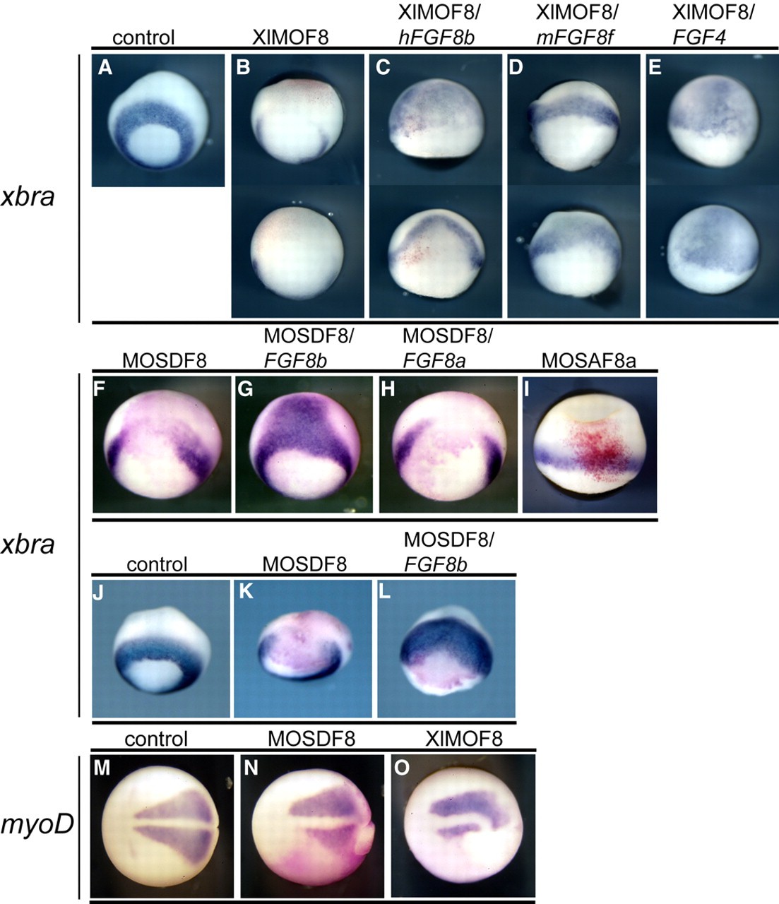 Fig. 4. Effects of FGF8 reduction on mesoderm formation. (A-I) X. laevis embryos; all embryos injected into the marginal zone of one cell at the two-cell stage; (F-H,K,L,N,O) pink staining for the fluorescein-conjugated control MO indicates injected side; (B-E,I) red-gal indicates injected side. (A) Control xbra expression; (B) XlMOF8 (40 ng) strongly reduces xbra expression (19/20 embryos), and this loss can be rescued by human FGF8b (13/17), mouse FGF8f (14/20) and Xenopus FGF4 (17/23) (C-E). (F) MOSDF8 (85 ng) reduces xbra expression (27/31 embryos); (G) FGF8b rescues MOSDF8 phenotype (33/40); but FGF8a does not rescue (32/42) (H). (I) MOSAF8a (FGF8a-specific) (60 ng) does not affect xbra expression (15/16). (J-L) X. tropicalis embryos. MOSDF8 (42 ng) reduces xbra expression (22/28) (K). FGF8b rescues MOSDF8 (30/37) (L). (M-O) X. laevis embryos, dorsal views with anterior to the left. (M) Control stage 13 myoD expression. (N) MOSDF8 85 ng (39/39 reduced); (O) XlMOF8 (30 ng) (22/22 reduced). |