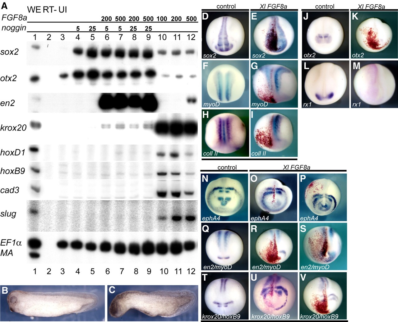Fig. 5. Effect of FGF8a overexpression on neural patterning. (A) FGF8a induces posterior neural genes in ectodermal explants. Embryos were injected into the animal hemisphere at the one-cell stage. Explants were excised at stage 9 and cultured until stage 20. Whole embryo (WE) stage-control embryo sample; whole embryo lysate processed without reverse transcriptase (RT-); explants from uninjected embryo (UI). Embryos were injected as indicated along the top. EF1α, loading control; muscle actin (MA) is an indicator of dorsal mesoderm. Endogenous neural gene expression domains are as follows: sox2, general neural tissue; otx2, forebrain and midbrain; en2, MHB; krox20, hindbrain r3 and r5; hoxD1, posterior hindbrain and spinal cord; hoxB9 and cad3, spinal cord. (B) Uninjected X. laevis tadpole; (C) FGF8a-injected tadpole. (D-V) Embryos displayed dorsoanteriorly; red staining indicates the lineage tracer. Embryos injected into a dorsal blastomere at the four-cell stage with 50 pg of FGF8a mRNA and cultured until neural tube stage 19/20. (D-I) FGF8a does not expand expression of the mesodermal genes myoD (32/32 embryos) or coll II (6/6), but sox2 expression domains are mispatterned and expanded (25/25). (M) Fluorescein-conjugated control MO was injected with the FGF8a mRNA as a lineage tracer (pink). (J-V) FGF8a expands posterior neural domains and reduces anterior neural domains. The displayed phenotypes are representative of the effects of FGF8a mRNA quantitated as follows: (K) otx2, 13/14; (M) rx1, 17/17; (O,P) ephA4, 33/35; (R,S) en2, 25/32; (U,V) krox20, 45/52; hoxB9, 43/44. |
