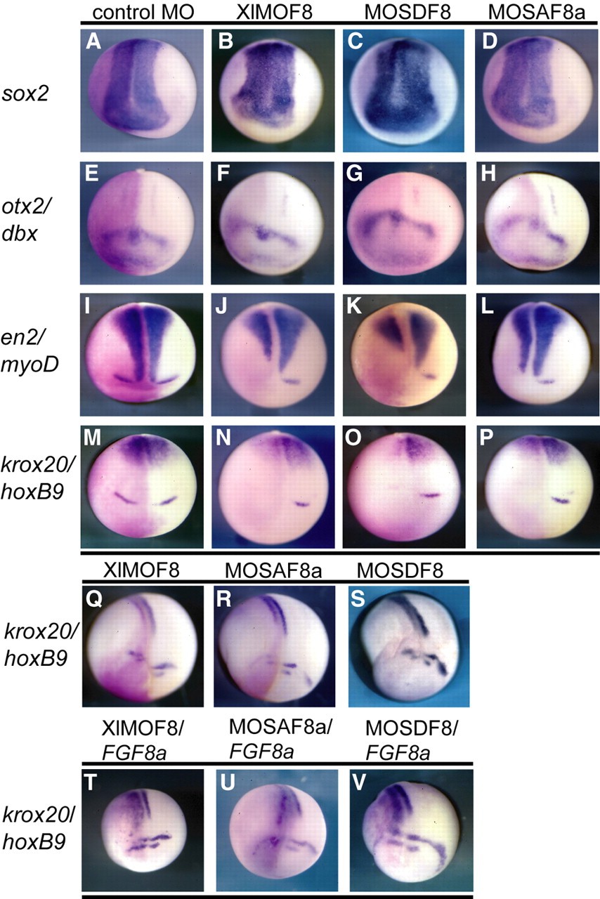 Fig. 6. Lower level reduction of FGF8a and FGF8b or strong reduction of FGF8a alone with XlMOF8, MOSDF8 and MOSAF8a prevents proper formation of posterior neural tissue at the early neurula stage.X. laevis embryos displayed dorsoanteriorly. Pink staining indicates the lineage tracer; embryos injected into one cell at the two- or four-cell stage. (A,E,I,M) Control MO (40 ng); (B,F,J,N) MOF8 20 ng; (C,G,K,O) MOSDF8 43 ng; (D,H,L,P) MOSAF8a 60 ng. (A-D) XlMOF8 (44/45), MOSDF8 (18/19) and MOSAF8a (38/39) cause a mispatterning of sox2 expression. (E-H) otx2 expression is expanded toward the posterior after XlMOF8 (23/25), MOSDF8 (20/20) and MOSAF8a (26/29) injection, while the posterior neural gene dbx is absent (MOF8, 25/25; MOSDF8, 20/20; MOSAF8a, 35/38). (I-L) en2 expression is diminished and sometimes completely absent on the injected side: XlMOF8 (13/13), MOSDF8 (17/17) and MOSAF8a (32/33). (M-P) both the spinal cord domain (hoxB9) and the hindbrain domain (krox20) is strongly reduced and shifted toward the posterior of the embryo on the XlMOF8 (42/42), MOSDF8 (20/20) and MOSAF8a (40/40) injected side of the embryo. Effects on the uninjected side are present but much weaker. (Q-S) Neural tube stage 20 embryos treated as indicated; (T-V) FGF8a mRNA (50 pg) rescued the reduction of hoxB9 caused by XlMOF8 (32/44), MOSAF8a (19/35) and MOSDF8 (19/20). |