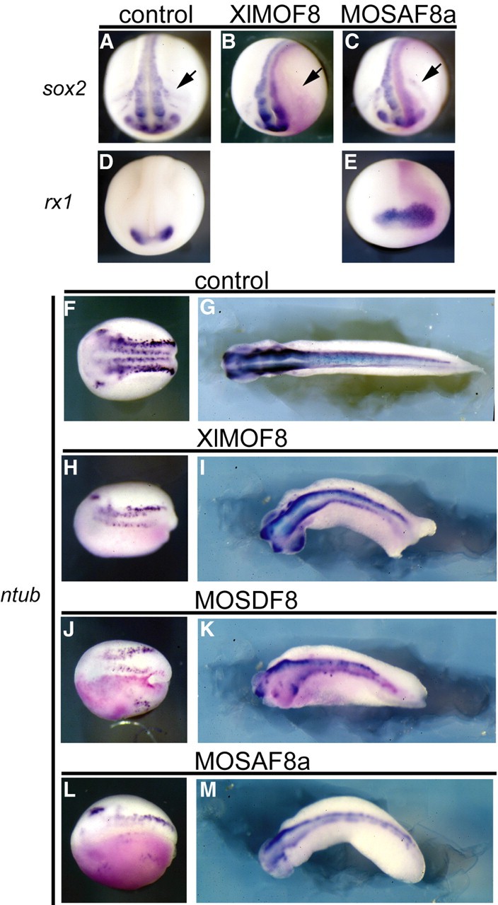 Fig. 7. Lowering FGF8 levels causes a reduction in placode formation and neural differentiation. (A-E) X. laevis embryos displayed dorsoanteriorly. Embryos were cultured with XlMOF8 (10 ng) or MOSAF8a (60 ng) until the neural tube stage 20; lineage tracer (pink). (B,C) XlMOF8 caused sox2 mispatterning (40/42), so did MOSAF8a but to a lesser degree (20/22). (E) MOSAF8a resulted in a slight expansion of the rx1 domain toward the posterior (16/20). (F-M) The effect of FGF8 reduction on early neuronal differentiation in X. tropicalis. XtMOF8 (8 ng), MOSDF8 (17 ng) and MOSAF8a (16 ng) were injected into one cell at the two-cell stage; injected side is oriented downwards. (F,H,J,L) Embryos were cultured until neurula stages; injected embryos demonstrate an early strong reduction in neuronal differentiation [XtMOF8 (20/20), MOSDF8 (9/9), MOSAF8a (16/16)]. (G,I,K,M) Embryos were cultured until the early tadpole stage; injected embryos demonstrate posterior truncations and continued reduction in differentiated neurons |