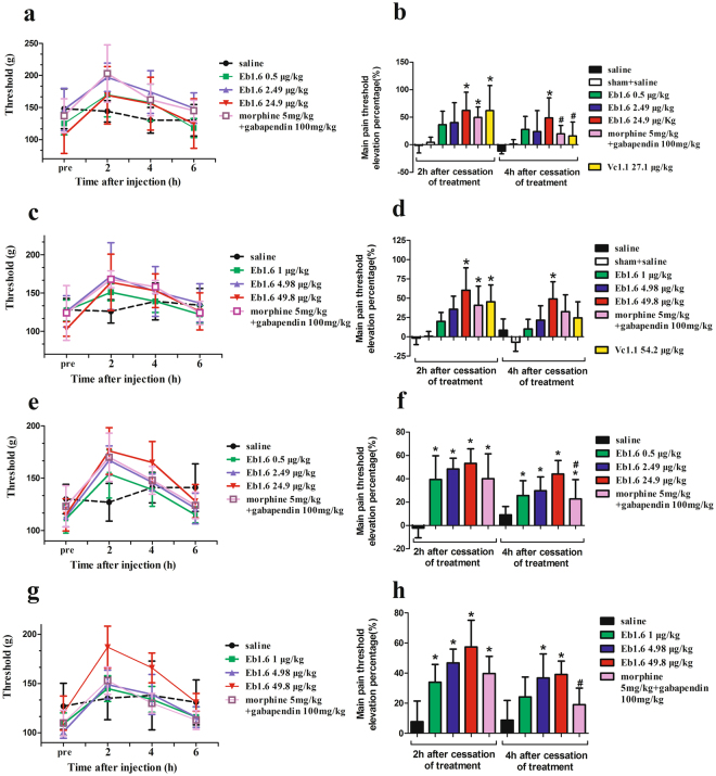 We here describe a novel α-conopeptide, Eu1.6 from Conus eburneus, which exhibits strong anti-nociceptive activity by an unexpected mechanism of action. Unlike other α-conopeptides that largely target nicotinic acetylcholine receptors (nAChRs), Eu1.6 displayed only weak inhibitory activity at the α3β4 and α7 nAChR subtypes and TTX-resistant sodium channels, and no activity at TTX-sensitive sodium channels in rat dorsal root ganglion (DRG) neurons, or opiate receptors, VR1, KCNQ1, L- and T-type calcium channels expressed in HEK293 cells. However, Eu1.6 inhibited high voltage-activated N-type calcium channel currents in isolated mouse DRG neurons which was independent of GABAB receptor activation. In HEK293 cells expressing CaV2.2 channels alone, Eu1.6 reversibly inhibited depolarization-activated Ba2+ currents in a voltage- and state-dependent manner. Inhibition of CaV2.2 by Eu1.6 was concentration-dependent (IC50 ~1 nM). Significantly, systemic administration of Eu1.6 at doses of 2.5-5.0 μg/kg exhibited potent analgesic activities in rat partial sciatic nerve injury and chronic constriction injury pain models. Furthermore, Eu1.6 had no significant side-effect on spontaneous locomotor activity, cardiac and respiratory function, and drug dependence in mice. These findings suggest α-conopeptide Eu1.6 is a potent analgesic for the treatment of neuropathic and chronic pain and opens a novel option for future analgesic drug design.