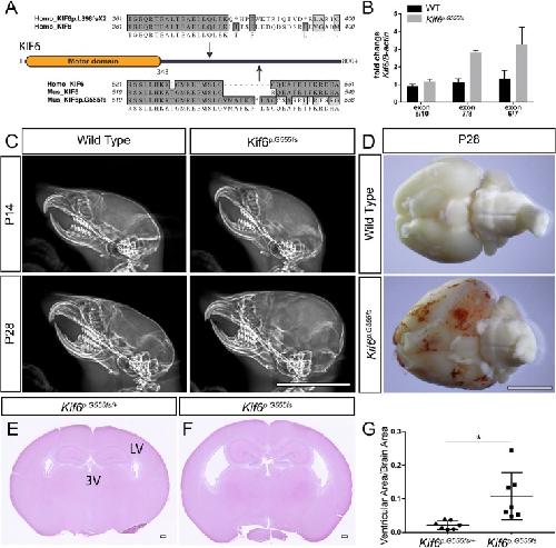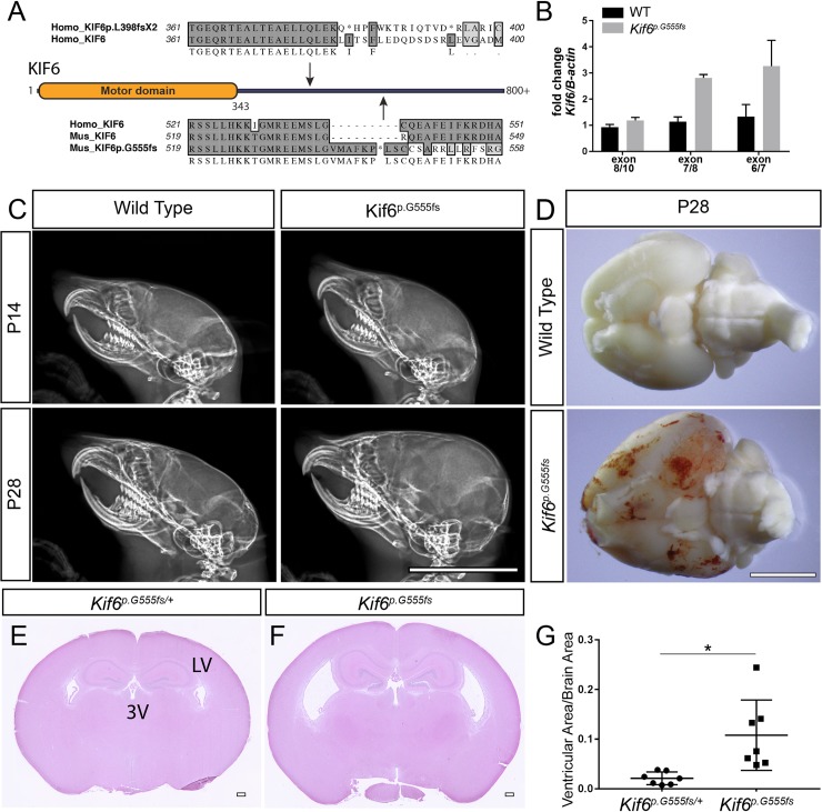 p.G555fs mutant mice display progressive hydrocephaly.(A) Schematic of the non-sense mutation in the patient (KIF6p.L398fsX2) and the mouse mutation (Kif6p.G555fs), both predicted to truncate the C-terminal domain of KIF6 protein. (B) qRT-PCR analyses of fold change of Kif6 expression using cDNA libraries derived from lateral ventricles from WT (black bars) and Kif6p.G555fs (gray bars) mutant mice. (C) Lateral X-rays of mouse cranium at P14 and P28 showing the progressive cranial expansion in Kif6p.G55 homozygous mutant mice. (D) Ventral view of whole mouse P28 brain to highlight hemorrhaging and slight enlargement of total brain size in Kif6p.G55 homozygous mutant mice. (E, F) H&E stained coronal sections of the mouse brain (P14), showing dilation of the lateral (LV) and third (3V) ventricles in Kif6p.G55 homozygous mutant mice (F). (G) Quantitation of ventricular area over total brain area in Kif6p.G55 homozygous mutant mice and heterozygous littermate controls (n = 7 mice per genotype; two-tailed t-test; p = 0.0173). Scale bars: 1cm in (C); 5mm in (D); and 300 μm in (F, F).