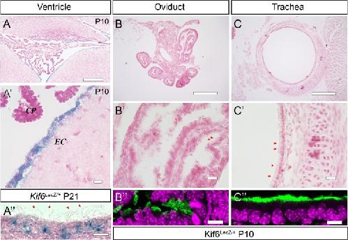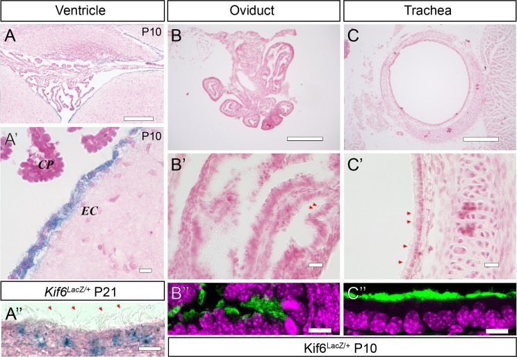 Fig 3. Kif6-LacZ expression is specific to the ependymal cells.(A-C', B”-C”) Representative LacZ staining in a variety of multiciliated tissues from P10 and P21 (A”) Kif6-LacZtm1b/+ transgenic mice. (A, A') Coronal section at the 4th ventricle showing specific LacZ expression in the ependymal cell (EC) layer and stark lack of expression in the choroid plexus (CP) or surrounding neuronal tissues. (B-C’) Sectioned oviduct and trachea tissue shows no LacZ expression, despite the presence of tufts of cilia observed under oblique lighting (red arrows B’, C’). Immunofluorescence shows acetylated tubulin labeling of ciliary axonemes in adjacent sections in oviduct which has supercoiled at this time point (B”) and in trachea (C”) at P10. LacZ staining labels the EC cells projecting tufts of cilia observed by oblique lighting (A”). Scale bars: 300μm in (A-C); 20μm in (A'-C'); and 10μm in (A”-C”).