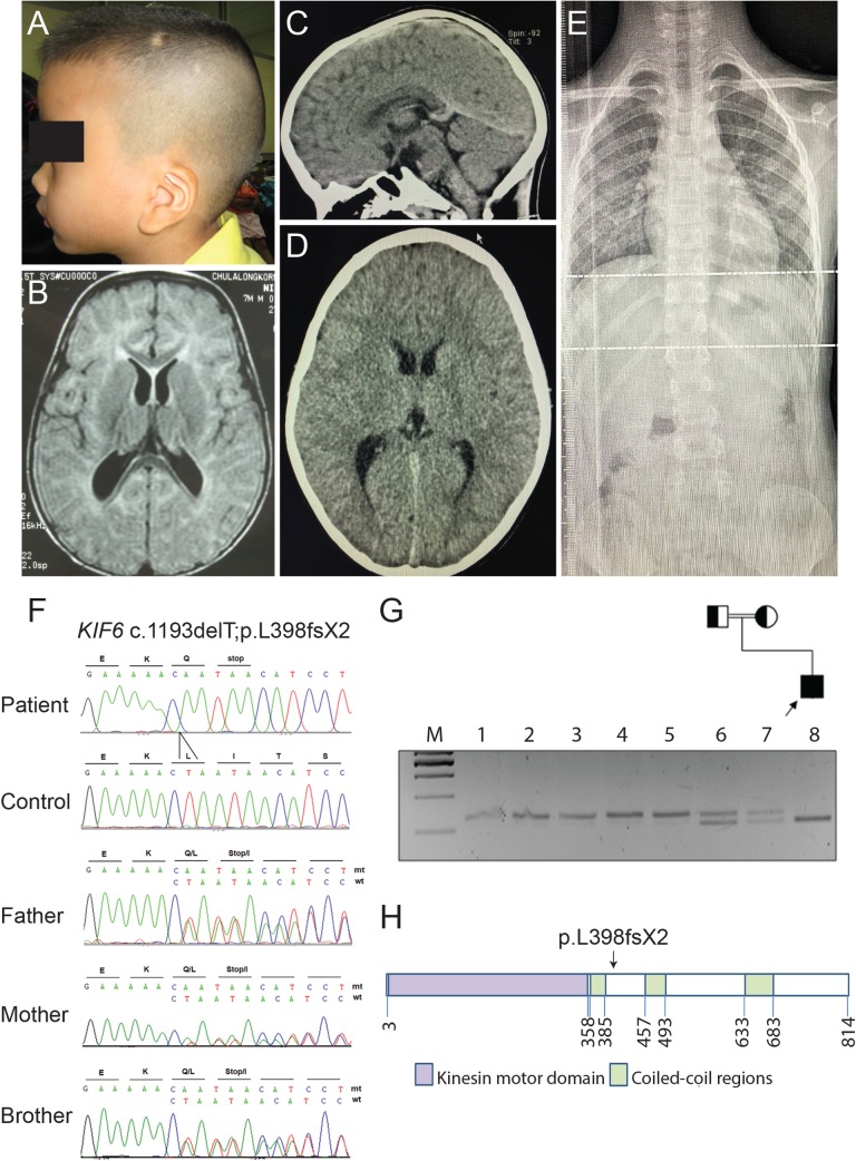 Fig 1. KIF6 mutation in a child with intellectual disability.(A) A low-set prominent anti-helical left pinna. (B) MRI of the brain at 7 months-old shows dolichocephaly with a normal brain structure. (C) and (D) CT of the brain at 8 years-old, sagittal and axial views, respectively show dolichocephalic shape of the cranium (cephalic index = 75) without demonstrable intracranial abnormality. (E) X-ray of the spine shows no scoliosis (F) Electropherograms of the patient, a control, the patient’s father, mother, and unaffected brother from top to bottom. The patient is homozygous for the c.1193delT mutantion while his father, mother, and unaffected brother are all heterozygous carriers. (G) Pedigree and RFLP, using MfeI restriction enzyme: Lane M = 100 bp marker. The arrow head indicates the 500 bp band. Lanes 1–5 are controls. Lanes 6 and 7 are the proband’s father and mother, respectively, showing that they are heterozygous. Lane 8 is the proband showing that he is homozygous for the c.1193delT. (H) Representative KIF6 structure. The arrow shows the position of the c.1193delT mutation.