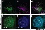 Confocal imaging of the mucocilated Xenopus laevis epidermis demonstrating consistent Kif6-GFP localization within the axonemes (green; A, C) and at the basal bodies (green; D, F). Expression of pan-membrane-RFP marker (magenta; B, C) to co-label the axonemes and Centrin-BFP (blue; E, F) to co-label the basal bodies. Scale Bars: 10μm.
