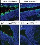 Fig 6. kif6 mutant zebrafish display defects in the formation of the ependymal cell cilia in the brain.(A-D) Immunofluorescence of Tg[foxj1a::GFP] (A, B) and Tg[foxj1a::Arl13bGFP] transgenic zebrafish in both heterozygous kif6sko/+ (A, C) and homozyogus kif6sko mutant (B, D) zebrafish backgrounds assayed with αGFP (green) and DAPI (nuclei, blue). The Tg[foxj1a::GFP] transgene demonstrates that GFP positive ECs are present in both genotypes. In contrast, kif6sko/+ heterozygous zebrafish display numerous apical tufts of cilia (red arrows; A) projecting into the ventricle lumen, which are markedly reduced in kif6sko mutant zebrafish (B). Similar results were observed with the Tg[foxj1a::Arl13bGFP] transgene, showing a obvious reduction in Arl13b-GFP positive EC axonemes in kif6sko mutant zebrafish (D), which are robustly labeled in kif6sko/+ heterozygous fish (C). Scale Bars: 20μm.