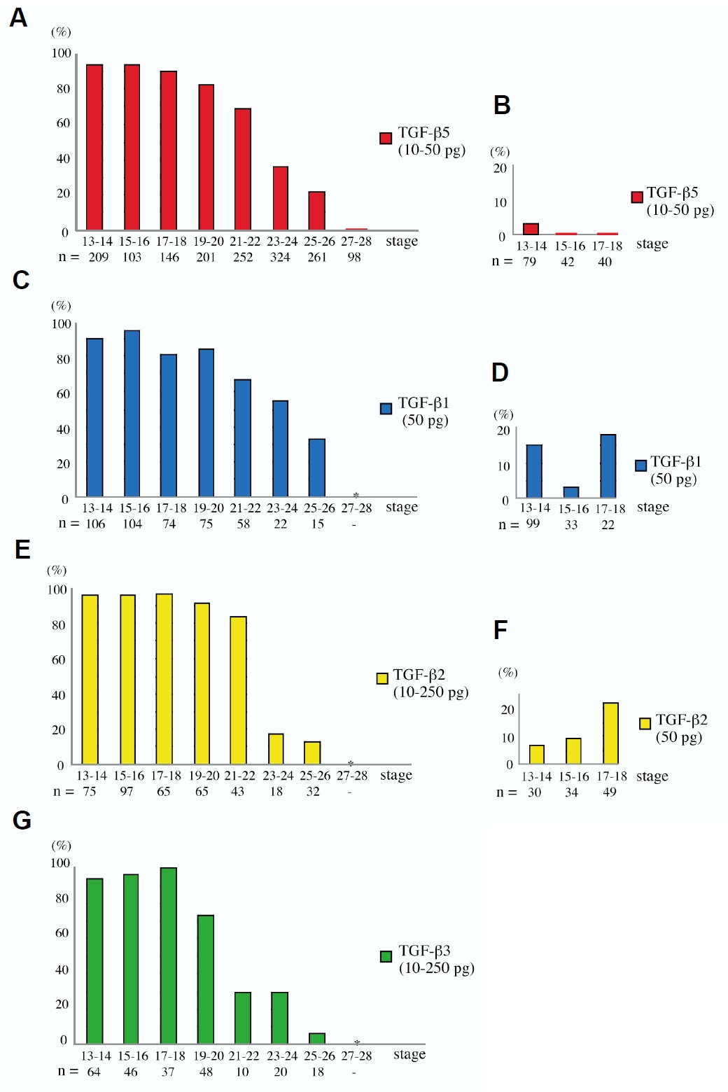 β1 (C,D), TGF-β2 (E,F) and TGF-