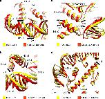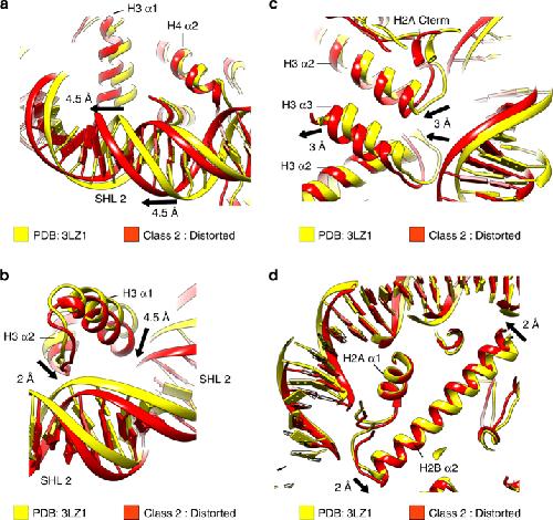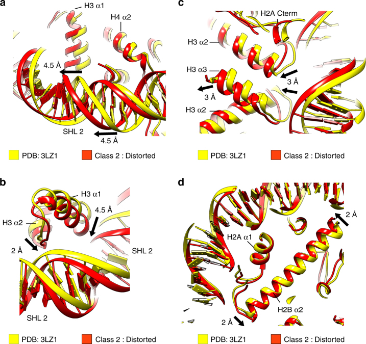 Fig. 2. Structural rearrangements in the histone core. Comparison of the X-ray structure (PDB:3LZ1, yellow) and the Class 2 model (red). Arrows depict the direction of the helix movements. The degree of movement between X-ray structure and the Class 2 model is shown, rounded to half an à . a Conformational rearrangement of H3 α1 and DNA at SHL 2. H3 α1 moves 4.5âà in Class 2 when compared with the X-ray structure. DNA at SHL 1.5 moves 4.5âà towards SHL 2. b Conformational rearrangement of the H3 α2, H3 α1, and DNA at SHL 2. The H3 α2 tilts by 2âà at its N-terminal end. The H3 α1 moves 4.5âà . H3 α1 and H3 α2 move toward each other and push the DNA at SHL 2.5 outward. c Conformational rearrangement of H3 α2, H3 α3, and DNA at the dyad. H3 α2 tilts and moves inward by 3âà at its C-terminal end. H3 α3 also moves inward by 3âà . Concomitantly, the DNA at the dyad moves more than 3âà toward the centre of the nucleosome. d Conformational rearrangement of H2B α2. H2B α2 tilts by 2âà toward the center of the nucleosome at SHL 3.5 and 2âà away from the center at SHL 5.5. This pushes the DNA at SHL 5.5 outward and pulls the DNA at SHL 3.5 inward |