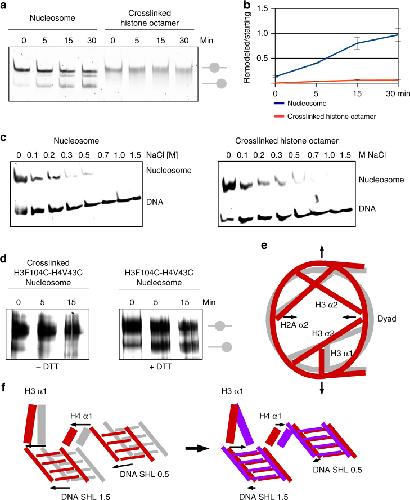 Fig. 5. Conformational rearrangement of the histone octamer is required for nucleosome sliding. a Thermal mobilization of nucleosomes on 227âbp DNA sequence containing 601 sequence in the middle. Native nuclesomes are re-positioned at 60â°C. Nucleosomes with cross-linked octamer did not move. b Quantification of three independent thermal shift assays showing that the cross-linked octamer does not move on DNA. The band intensity was quantified at starting and remodeled position at each time point. SD of three independent experiments is shown. c Salt-induced disassembly of native and cross-linked nucleosomes. Cross-linked nucleosomes disassemble at elevated salt concentration, indicating that histone octamer did not cross-link with the DNA. d Thermal mobilization of nucleosomes on 227âbp DNA sequence containing 601 sequence in the middle. NCP with the disulfide bridge between H3 F104C and H4 V43C is immobilized in the thermal shift assay. Upon addition of the reducing agent (DTT), nucleosomes are mobile again. e Model showing the conformational changes in the histone octamer that lead to nucleosome distortion. Tilting of the long α2 helices of H3, H2A, and H2B contracts the nucleosome along the symmetry axis and stretches the nucleosome in the perpendicular direction. This rearrangement of the octamer also moves the DNA. DNA gyres move by >â4âà at SHL 1.5â2.5 and SHL 5.5â6.5. Canonical nucleosome is shown in gray, distorted in red. f Model showing DNA translocation at SHL 2. In the first step of DNA translocation, DNA and the H3/H4 α1 helices move >â4âà , leading to nucleosome distortion (Class 2). In the next step, the H3 α1 dissociates from the DNA and translocates to DNA strand, which was previously bound by the H4 α1. The H4 α1 detaches from the DNA at SHL 1.5 and binds the DNA at SHL 0.5. This leads to translocation of the DNA by the histone octamer at SHL 2. The DNA is pushed further and moves by >â5âà when compared with X-ray structures. Arrows indicate direction of the movement. Canonical nucleosome is shown in gray, distorted in red, and translocated in purple |