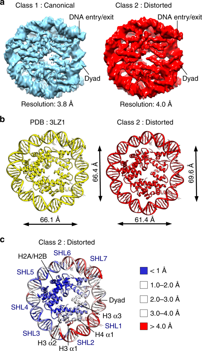 Fig. 1. Structural plasticity of the nucleosome core particle (NCP). a Cryo-EM maps of the NCP in two distinct conformations. Class 1 (left, blue) resembles canonical nucleosome, whereas Class 2 (right, red) is in distorted conformation. Class 1 is resolved to 3.85 Å and Class 2 to 4.05 Å (0.143 cutoff in FSC curve). Class 1 contains 51 000 particles and Class 2 contains 58 000 particles. b Global changes in the nucleosome structure. Comparison of X-ray structure (PDB:3LZ1) and Class 2 (distorted nucleosome) models. The nucleosome core particle contracts along the symmetry axis by 8% (distance between nucleotides 2 and 38) and expands in the perpendicular direction by 5% (distance between nucleotides 17 and 58). c RMSD between the X-ray structure (PDB:3LZ1) and the Class 2 model, showing the extent of rearrangements in the NCP. The X-ray structure and the Class 2 model were superimposed and RMSD of Cα was calculated and depicted. DNA at SHL 1–2 and SHL 6–7 shows the largest movements between these two structures (> 4 Å). H3 α1, α2, and α3 show the largest rearrangements in the histone octamer |