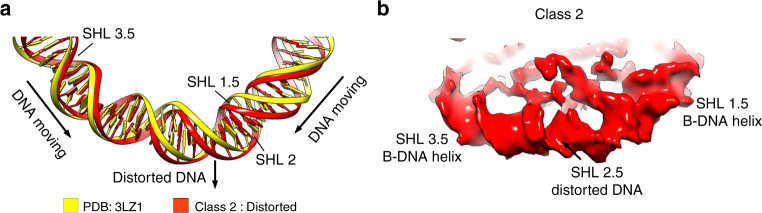 Fig. 3. Structural rearrangement of the histone core distorts the DNA at SHL 2. a Depiction of the DNA organization in the nucleosome in the X-ray structure and Class 2 cryo-EM map at SHL 2. At SHL 1.5, the DNA moves outward and toward SHL 2.5. At SHL 3.5, DNA is pulled inward and toward SHL 2.5. b Close-up view at SHL 2.5 in the Class 2 cryo-EM map. In the Class 2 map, the DNA at SHL 2.5 is less defined and does not resemble a B-DNA helix, indicating distortion in the DNA structure at SHL 2.5. At SHL 1.5 and SHL 3.5, the DNA is well resolved and resembles a B-DNA helix |