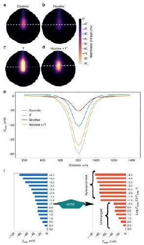 Figure 3. BETSE model predicts that nicotine suppresses neural tube hyperpolarization and HCN2 recovers neural tube hyperpolarization in presence of nicotine. aâe) BETSE model of a stage 15 Xenopus embryo where cells are assumed to be facing 0.1âÃâMMR. a) Control model exhibits a characteristic Vmem pattern featuring relative hyperpolarization in the neural tube area and depolarization everywhere else. This Vmem pattern is actually seen in the Xenopus embryos with voltage reporter dyes28. b) Nicotine treatment of the control model is predicted to preferentially depolarize the neural tube area to suppress the Vmem gradient. c) Model with ion translocator (IT) expression in all cells, acting in a context-specific manner showing strongly enhanced neural tube Vmem pattern. d) Adding the ion translocator (IT) to the nicotine treated model shows the Vmem pattern significantly retained in comparison to the only nicotine treated model of b. e) Line graph showing the information retrieved along the white dotted lines depicted in (aâd), which allows for easy comparison between models. f) The effect of the HCN2 channel on the Vmem of a series of cells with different membrane leak permeabilities (Pmem). The ability of homogeneously expressed HCN2 channels to act in a context specific manner is predicted to stem from the channelsâs opening at hyperpolarized Vmem with a hyperpolarizing effect upon opening. This selectively hyperpolarizes cells while leaving relatively more depolarized cellâs Vmem unchanged. This further emphasizes that HCN2 channels amplify the endogenous Vmem pattern of the neural tube and maintain the Vmem pattern against nicotine depolarization exactly like IT in (c, d and e) |