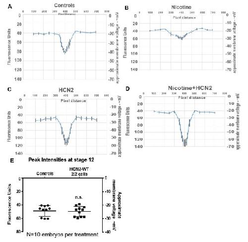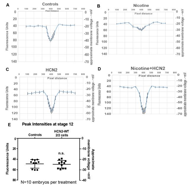 Figure 4. Validation of the model prediction of nicotine effects and HCN2-induced recovery of membrane voltage prepatterns. Representative CC2-DMPE:DiBAC4(3) images of stage ~15 Xenopus embryos: a) untreated controls, b) nicotine-exposed (0.1âmg/mL â stage 10â35), c) Hcn2-WT mRNA microinjected (0.75 ng/injection) in both blastomeres at 2-cell stage, and d) nicotine-exposed (0.1âmg/mL â stage 10â35) and Hcn2-WT mRNA microinjected (0.75 ng/injection) in both blastomeres at 2-cell stage. Control embryos show the characteristic hyperpolarization (solid yellow arrow) as previously reported28. Nicotine-treated embryos show reduced signal (depolarized) within the neural tube (hollow yellow arrow). Hcn2-WT mRNA microinjection show enhanced signal (hyperpolarized) within the neural tube (magenta arrows), in presence or absence of nicotine exposure. e) Quantification of CC2-DMPE:DiBAC4(3) images of stage ~15 Xenopus embryos along the red dotted line as indicated in the inset illustration, along with electrophysiology based membrane voltage approximations (as previously reported in refs.27,28). The fluorescence intensity/membrane voltage pattern within the neural tube (indicated by the black dotted line in the inset illustration and corresponding lack dotted line in the graph) is significantly reduced (depolarization) in nicotine-exposed embryos in comparison to controls. Hcn2-WT mRNA microinjection significantly enhances the fluorescence intensity/membrane voltage patterns within the neural tube in comparison to controls. Nicotine-exposed embryos that are microinjected with Hcn2-WT mRNA maintain a significantly enhanced fluorescence intensity/membrane voltage pattern within the neural tube in comparison to only nicotine-treated embryos. Nâ=â10 embryos for each treatment group at each of the indicated spatial distance in pixels were collected from multiple animals across independent clutches. Data is plotted as meanâ±âS.E.M. Data at black line (400 Pixels) was analyzed using one way ANOVA, *pâ<â0.05, **pâ<â0.01. (f) Quantification of peak fluorescence intensity and electrophysiology based membrane voltage approximations (as previously reported in ref. 27,28) from voltage reporter dye images (CC2-DMPE:DiBAC4(3)) of ~stage 15 Xenopus embryos within the neural tube at the intersection of the red and black dotted lines in the inset illustration in (a). Nicotine exposure significantly reduced (depolarizes) the neural tube peak intensity/membrane voltage in comparison to controls. Hcn2-WT mRNA microinjection, both in presence or absence of nicotine, significantly enhances (hyperpolarizes) the neural tube peak intensity/membrane voltage in comparison to controls. Nâ=â10 embryos for each treatment group at each of the indicated spatial distance in pixels were collected from multiple animals across independent clutches. Data is plotted as meanâ±âSD and was analyzed using one way ANOVA, *pâ<â0.05, **pâ<â0.01, ***pâ<â0.001 |