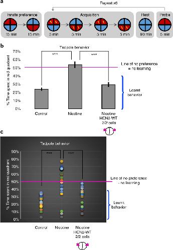 Figure 7. HCN2 channels restore associative learning capacity in nicotine-exposed embryos. Associative learning capacity analysis for stage 45â50 tadpoles either left untreated (controls) or exposed to nicotine (0.1âmg/mL â stage 10â35) with or without microinjections of Hcn2-WT mRNA (0.75 ng/injection) in both blastomeres at 2-cell stage as indicated in the illustrations. a) The training regime used consisted of an innate preference test, a training phase, a rest period, and a learning probe. Tadpoles were placed individually in the behavior analysis robot. Motion tracking cameras under each tadpole recorded its position/behavior, and automated software executed a training cycle where animals received a shock when occupying the red half of the arena. Training, rest and testing sessions were repeated a total of six times across the trial. b) Quantification of time spent in the red color during the final testing probe for tadpoles in each treatment group. Nâ>â20 for each experimental group. Error bars indicateâ±âS.E.M. Data were analyzed using one way ANOVA ***pâ<â0.001. c Representation of individual tadpoleâs associative learning test. Nâ>â20 for each experimental group. Following the training sessions a significant red light aversion was generated in control tadpoles. Majority of nicotine-exposed tadpoles failed to demonstrate red light aversion learning during testing. Nicotine-exposed tadpoles microinjected with Hcn2-WT mRNA showed a restored ability to learn associative red light aversion |