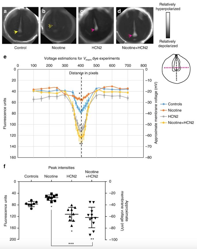 Fig. 4. Validation of the model prediction of nicotine effects and HCN2-induced recovery of membrane voltage prepatterns. Representative CC2-DMPE:DiBAC4(3) images of stage ~15 Xenopus embryos: a untreated controls, b nicotine-exposed (0.1 mg/mL – stage 10–35), c Hcn2-WT mRNA microinjected (0.75 ng/injection) in both blastomeres at 2-cell stage, and d nicotine-exposed (0.1 mg/mL – stage 10–35) and Hcn2-WT mRNA microinjected (0.75 ng/injection) in both blastomeres at 2-cell stage. Control embryos show the characteristic hyperpolarization (solid yellow arrow) as previously reported28. Nicotine-treated embryos show reduced signal (depolarized) within the neural tube (hollow yellow arrow). Hcn2-WT mRNA microinjection show enhanced signal (hyperpolarized) within the neural tube (magenta arrows), in presence or absence of nicotine exposure. e Quantification of CC2-DMPE:DiBAC4(3) images of stage ~15 Xenopus embryos along the red dotted line as indicated in the inset illustration, along with electrophysiology based membrane voltage approximations (as previously reported in refs.27,28). The fluorescence intensity/membrane voltage pattern within the neural tube (indicated by the black dotted line in the inset illustration and corresponding lack dotted line in the graph) is significantly reduced (depolarization) in nicotine-exposed embryos in comparison to controls. Hcn2-WT mRNA microinjection significantly enhances the fluorescence intensity/membrane voltage patterns within the neural tube in comparison to controls. Nicotine-exposed embryos that are microinjected with Hcn2-WT mRNA maintain a significantly enhanced fluorescence intensity/membrane voltage pattern within the neural tube in comparison to only nicotine-treated embryos. N = 10 embryos for each treatment group at each of the indicated spatial distance in pixels were collected from multiple animals across independent clutches. Data is plotted as mean ± S.E.M. Data at black line (400 Pixels) was analyzed using one way ANOVA, *p < 0.05, **p < 0.01. (f) Quantification of peak fluorescence intensity and electrophysiology based membrane voltage approximations (as previously reported in ref. 27,28) from voltage reporter dye images (CC2-DMPE:DiBAC4(3)) of ~stage 15 Xenopus embryos within the neural tube at the intersection of the red and black dotted lines in the inset illustration in (a). Nicotine exposure significantly reduced (depolarizes) the neural tube peak intensity/membrane voltage in comparison to controls. Hcn2-WT mRNA microinjection, both in presence or absence of nicotine, significantly enhances (hyperpolarizes) the neural tube peak intensity/membrane voltage in comparison to controls. N = 10 embryos for each treatment group at each of the indicated spatial distance in pixels were collected from multiple animals across independent clutches. Data is plotted as mean ± SD and was analyzed using one way ANOVA, *p < 0.05, **p < 0.01, ***p < 0.001 |