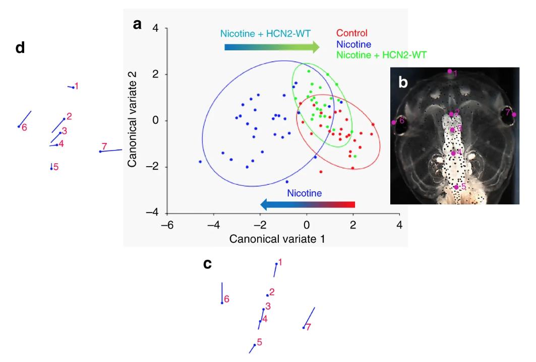 Fig. 6. HCN2 channels restore the brain size relation to anterior head shape in nicotine-exposed embryos. Morphometrics canonical variate analysis of brain size relation to anterior head shape of stage 45 tadpoles. a Graphical output, showing confidence ellipses for means, at a 0.95 probability, of shape data from controls and nicotine-exposed (0.1 mg/mL – stage 10–35) tadpoles with or without Hcn2-WT mRNA (0.75 ng/injection) microinjected in both blastomeres at 2-cell stage. Ellipses are colored to correspond with treatment as indicated. N > 26 for each group. Procrustes distances show objective alteration of brain size in relation to head morphology by nicotine exposure in relation to controls as indicated by the red-blue arrow. Hcn2-WT mRNA microinjection along with nicotine exposure moves the brain size—head shape relation closer to controls as indicated by the blue-green arrow. b Stage 45 control tadpole image illustrating the 7 landmarks considered for this analysis comparing brain size and head shape. Landmarks 2, 3, 4, and 5 show the start of forebrain, transition to midbrain, transition to hindbrain, and end of hindbrain, respectively. Landmarks 1, 6, and 7 indicate the anterior most, and lateral most points of the head shape. c Canonical variate 1 axis legends (ball and stick diagrams) showing movement of each of the 7 landmarks in mainly anterior-posterior direction. Each ball represents the landmark as indicated by the number and the accompanying stick represents the direction and extent of movement of that particular landmark. d Canonical variate 2 axis legends (ball and stick diagrams) showing movement of each of the 7 landmarks in mainly lateral direction. Each ball represents the landmark as indicated by the number and the accompanying stick represents the direction and extent of movement of that particular landmark |
