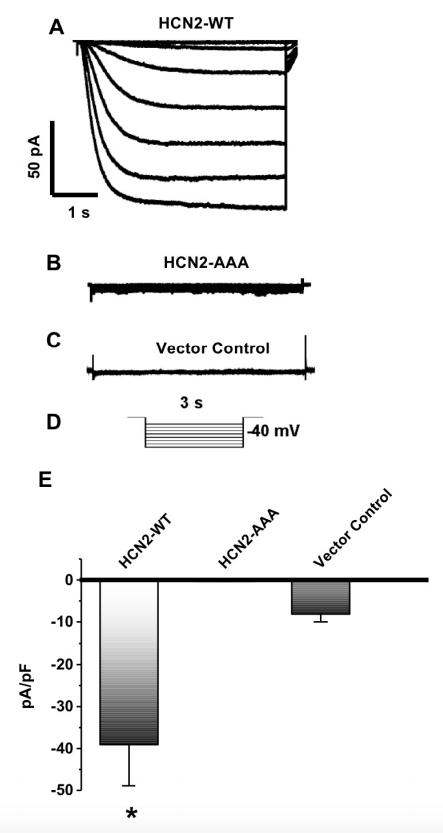 Supplementary Figure 2: Dominant-negative effects of HCN2-AAA in HEK293 cells. Representative HCN current traces recorded from HEK293 cells expressing HCN2-WT (A), HCN2-AAA (B), and empty vector control (C). IHCN (HCN current) was elicited by recording protocol (D) containing stepwise hyperpolarization to -120 mV from holding potential of -40 mV and normalized to membrane capacitance. Summary data for peak IHCN from HEK293 cells expressing HCN2-WT, HCN2-AAA, and vector control is shown in (E). One way ANOVA, *p<0.05 (n=4). |