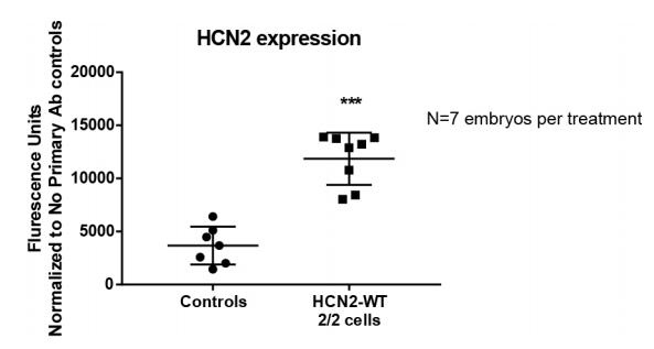 Supplementary Fig. 3: HCN2 expression levels in Hcn2-WT injected embryos. Quantification of HCN2 immunostained stage ~12 Xenopus embryos which were either left uninjected (controls) or injected with Hcn2-WT mRNA in both blastomeres at two-cell stage. Hcn2-WT injected embryos show a significantly high level of HCN2 channel expression (~3.1 times/310%). Embryos were obtained from multiple animals across independent clutches. Immunostaining was quantified using ImageJ software. Data were analyzed by t-test and plotted as mean ± SD; ***-p<0.001. |