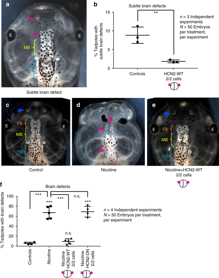 Fig. 5. HCN2 channels rescue nicotine-induced brain morphology defects in Xenopus embryos. a Representative image of stage 45 tadpole with an example of a minor brain morphology defect showing smaller forebrain and nostril on the left (magenta arrowhead), normal midbrain (MB - yellow bracket) and normal hindbrain (HB - cyan bracket). b Quantification of stage 45 tadpoles for subtle changes in overall brain morphology with or without microinjecting Hcn2-WT (wild-type) mRNA (0.75 ng/injection) in both blastomeres at 2-cell stage as indicated in the illustrations. Hcn2-WT mRNA injections significantly suppress the minor brain defects seen in uninjected control embryos. Three independent experiments (n = 3) were conducted with N > 50 embryos per treatment group for each of those experiments, collected from multiple animals across independent clutches. Data were analyzed with t-test and graphed as mean ± SD, **p < 0.01. Representative images of stage 45 tadpoles: c control tadpole showing nostrils (blue arrowhead), forebrain (FB) indicated by the orange bracket, midbrain (MB) indicated by the yellow bracket, and hind brain (HB) indicated by the cyan bracket, d tadpole from embryos exposed to nicotine (0.1 mg/mL – stage 10–35) showing severe brain morphology defects as indicated by magenta arrowheads. e tadpole from embryos exposed to nicotine (0.1 mg/mL – stages 10–35) and microinjected with Hcn2-WT mRNA (0.75 ng/injection) in both blastomeres at 2-cell stage showing intact nostrils (blue arrowheads), forebrain (FB - orange brackets), midbrain (MB - yellow brackets), and hindbrain (HB - cyan brackets). f Quantification of stage 45 tadpoles for major brain morphology phenotypes in absence or presence of nicotine exposure (0.1 mg/mL – stage 10–35) with or without microinjection of Hcn2-WT or Hcn2-DN (dominant-negative) mRNA (0.75 ng/injection) in both blastomeres at 2-cell stage as indicated in the illustrations. A significantly high incidence of malformed brain was observed in embryos exposed to nicotine in comparison to controls. Hcn2-WT mRNA injection significantly reduced the incidence of malformed brain, while Hcn2-DN mRNA injection had no significant effect on nicotine exposure induced malformed brain. Three independent experiments (n = 3) were conducted with N > 50 embryos per treatment group for each of those experiments collected from multiple animals across independent clutches. Data were analyzed with one way ANOVA and Tukey’s post-test and graphed as mean ± SD,***p < 0.001, n.s. non-significant |