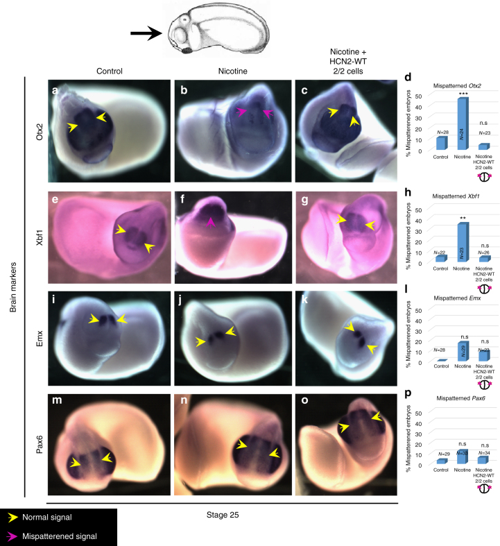 Figure 8. HCN2 channels restore nicotine exposure induced mispatterning of brain markers during neural development. Stage 25 embryos as illustrated with the angle of view marked by the black arrow. Control (untreated/uninjected) embryos (a, e, i, l), embryos exposed to nicotine (0.1âmg/mL â stage 10 onwards) (b, f, j, n), and nicotine-exposed embryos microinjected with Hcn2-WT mRNA (0.75 ng/injection) in both blastomeres at 2-cell stage (c, g, k, o). In situ hybridization for Otx2 (aâd), Xbf1 (eâh), Emx (iâl), and Pax6 (mâp) show that nicotine exposure leads to significantly mispatterned expression (magenta arrows) of Otx2 [46% nâ=â24] and Xbf1 [35% nâ=â23], but has little effect on Emx [17%, nâ=â29] and Pax6 [12%, nâ=â33] in comparison to controls [10%, nâ=â28, 4.5%, nâ=â22, 0%, nâ=â28, and 3%, nâ=â29, respectively]. Nicotine-exposed embryos that were also microinjected with Hcn2-WT mRNA showed largely normal expression of Otx2 [4% nâ=â23], Xbf1 [4% nâ=â26], Emx [9% nâ=â23], and Pax6 [6% nâ=â34] in comparison to controls |