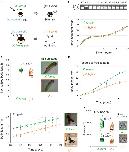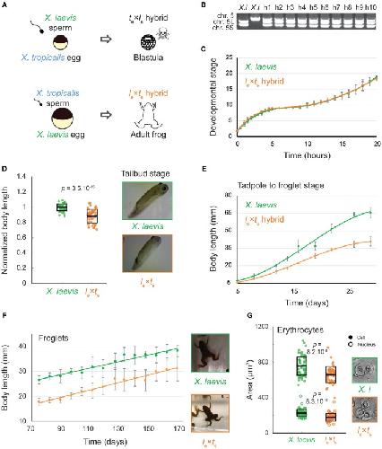 Figure 1. Growth and development of Xenopus le à ts viable hybrids. (A) Schematic of developmental outcomes of Xenopus laevis and Xenopus tropicalis cross-fertilization. (B) Agarose gel electrophoresis showing PCR amplification of 2 genomic loci in X. laevis (X. l, on chromosomes 5L and S) and one locus in X. tropicalis (X. t, chromosome 5). H1-10 indicates 10 randomly chosen hybrid tadpoles tested, confirming the consistent presence of all 3 subgenomes in hybrids. (C) Developmental timing in X. laevis and le à ts hybrid embryos. Average is plotted for each time point. Error bars show standard deviation. (D) Body length of tailbud stage X. laevis and le à ts hybrids. Box plots show all individual body lengths. Thick line inside box = average length, upper and lower box boundaries = ±standard deviation (SD). P-value was determined by two-tailed heteroscedastic t-test. Representative images of tailbuds at identical scale are shown on the right. (E) Body length of tadpoles throughout metamorphosis for X. laevis and le à ts hybrids. Average is plotted for each time point. Error bars show standard deviation. (F) Body length of X. laevis and le à ts hybrid froglets. Average is plotted for each time point. Error bars show standard deviation. Representative images of froglets at identical scale are shown on the right. (G) Size of erythrocyte cells and nuclei in X. laevis and le à ts hybrid adult frogs. Box plots show all individual cell or nuclear areas. Thick line inside box = average area, upper and lower box boundaries = ± SD. P-values were determined by two-tailed heteroscedastic t-test. Representative images of erythrocytes at identical scale are shown on the right.