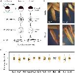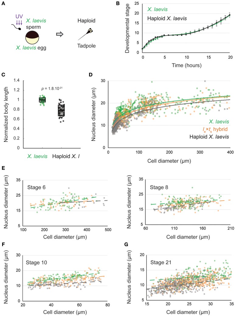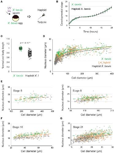 Figure 2. Nuclear to cell size relationships pre- and post-zygotic genome activation in le × ts hybrids compared to X. laevis diploids and haploids. (A) Schematic of generation of haploid X. laevis tadpoles via UV irradiation of sperm. (B) Developmental timing in X. laevis and haploid X. laevis embryos. Average is plotted for each time point. Error bars show standard deviation. (C) Body length of tailbud stage X. laevis and haploid X. laevis. Box plots show all individual body lengths. Thick line inside box = average length, upper and lower box boundaries = ± SD. P-value was determined by two-tailed heteroscedastic t-test. (D) Nuclear diameter vs. cell diameter in X. laevis, X. laevis haploid, and le × ts hybrid embryos. (E) Nuclear diameter vs. cell diameter in X. laevis, X. laevis haploid, and le × ts hybrid embryos at developmental stages 6 and 8. (F) Nuclear diameter vs. cell diameter in X. laevis, X. laevis haploid, and le × ts hybrid embryos at developmental stage 10. (G) Nuclear diameter vs. cell diameter in X. laevis, X. laevis haploid, and le × ts hybrid embryos at developmental stage 21. For (E–G), we ran an analysis of covariance (ANOCOVA test) to determine whether the nuclear to cell size scaling significantly depends on the embryo types. At stage 6, p = 0.132, at stage 8, p = 0.126, at stage 10, p = 2.558 × 10−6, and at stage 21, p = 1.110 × 10−7.
