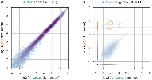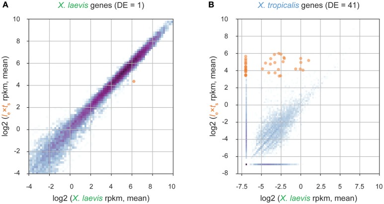 Figure 3. Transcriptome analysis of le × ts hybrid embryos at the onset of zygotic genome activation. (A) Differential expression analysis of X. laevis maternal genes in stage 9 le × ts hybrid vs. X. laevis embryos. (B) Differential expression analysis of X. tropicalis paternal genes in stage 9 le × ts hybrid vs. X. laevis embryos. For both figures, RNA-seq reads are mapped to a database of combined X. laevis and X. tropicalis transcriptomes and significantly differentially expressed genes (DE; fold-change >2 and false discovery rate < 0.05) are marked in orange (see section Materials and Methods for more information).