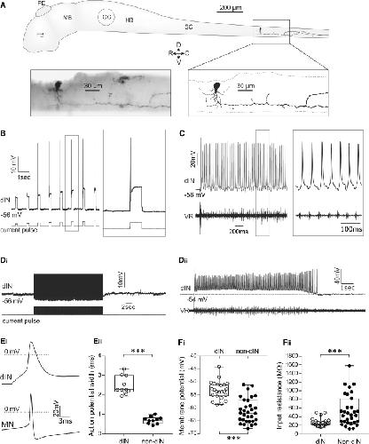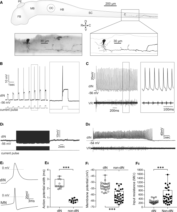 Figure 1. Properties of dINs in Stage 42 Larval Xenopus Tadpoles(A) The anatomy of a dIN. The axon courses ventrally and then caudally. Arrows on the image indicate the direction of the axon. FB, forebrain; HB, hindbrain; MB, midbrain; OC, otic capsule; PE, pineal eye; SC, spinal cord.(B) Responses of a dIN to depolarizing current pulses of increasing amplitude. Unlike non-dINs, suprathreshold pulses at all amplitudes generate only a single spike.(C) During swimming, dINs also only fire a single spike per swim cycle. VR, ventral root.(D) Unlike all other neuron types in the Xenopus spinal motor circuit, dINs never display a usAHP in response to a protocol inducing repetitive spiking (Di) or after swimming (Dii). Note that action potentials in (Di) have been truncated.(E) The action potential shape of larval dINs is different from non-dINs. Examples of a dIN and motoneuron (MN) action potential in response to a suprathreshold depolarizing pulse (Ei) are shown. Pooled action potential width of dINs and non-dINs measured at 0 mV (Eii; n = 10; ∗∗∗p < 0.001; median with 50% interquartile range (IQR) displayed as box-and-whisker plots).(F) The intrinsic properties of dINs (n = 28) differ from non-dINs (n = 31) and display a significantly more depolarized RMP (Fi) and significantly lower input resistance (Fii; median with 50% IQR displayed as box-and-whisker plots). ∗∗∗p < 0.001. See also Figure S1.
