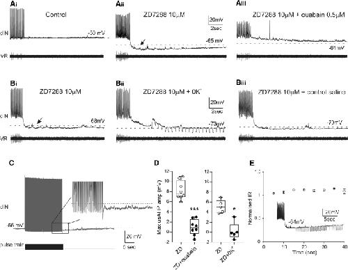 Figure 6. Blocking Ih Revealed a Post-swim usAHP(A) Following dIN firing in control, (Ai) the membrane potential repolarized to the baseline. (Aii) In the presence of 10 μM ZD7288, the RMP hyperpolarized (dashed line) and a long-lasting AHP appeared following the end of a swimming episode. (Aiii) The usAHP was abolished after adding 0.5 μM ouabain in the bath.(B) Another dIN displayed a usAHP in the presence of ZD7288 (Bi). Removing K+ ions from saline abolished the usAHP (Bii). After replacing 0K+ saline with control saline, the usAHP reappeared (Biii). Dotted lines in (A) and (B) indicate the resting membrane potentials. Downward deflections in (Bii) are conductance pulses.(C) A train of depolarizing pulses that mimics swimming was applied to dINs following ZD7288 treatment. A small afterhyperpolarization was observed in some dINs (8 out 12), which was never observed in control (see Figure 1Di).(D) Pooled data indicate that the maximum amplitude of usAHP was reduced significantly by 0.5 μM ouabain (left panel; n = 8; ∗∗∗p < 0.001) or 0K+ saline (right panel; n = 5; ∗p = 0.011). Data are expressed as median with 50% IQR and displayed as box-and-whisker plots with individual data points.(E) The input resistance (IR) during the usAHP period was tested and plotted against time. The inset shows an example of current pulses injected during usAHP period. Pooled data indicate that there was no significant change in input resistance during the usAHP (n = 3; one-way ANOVA; p = 0.26; mean ± SD).