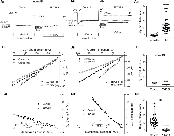 Figure 2. Ih Is Present in All dINs and in Some Non-dINs and Is Blocked by ZD7288(A) An example of a sag potential in a non-dIN (Ai) with and without ZD7288 (50 μM). The peak and steady-state membrane potential responses are indicated by dashed lines. (Aii) An example response of a dIN to hyperpolarizing current pulses (3-s duration). ZD7288 (10 μM) hyperpolarized the RMP (see also Figure 3) and abolished the large sag potentials observed at hyperpolarized membrane potentials. Arrow, post-inhibitory depolarization seen in control; arrow head, the membrane potential rebound was absent in the presence of ZD7288. (Aiii) Pooled data showing a comparison of the sag amplitude between −80 and −90 mV in dINs (n = 27) and non-dINs (n = 34; ∗∗∗p < 0.001; median with 50% IQR displayed as box-and-whisker plots).(B) The voltage-current (V-I) relationship for a non-dIN (Bi) and a dIN (Bii) in response to hyperpolarizing current pulses (3-s duration) of increasing amplitude (10 pA incremental steps) and the effect of 10–50 μM ZD7288. For both control (closed circles) and in ZD7288 (open circles), the peak (p) and the steady-state (ss) membrane potential change are plotted against each injected current amplitude.(C) The amplitude of the sag potentials in a non-dIN (Ci) and a dIN (Cii) was plotted against the membrane potential with (open circles) or without (closed circles) ZD7288.(D) Pooled data showing that ZD7288 (10–50 μM) significantly abolished the sag potential observed around −80 mV. Data are expressed as median with 50% IQR and displayed as box-and-whisker plots with individual data points. (Di): 3 non-dINs, p = 0.0048; (Dii): 23 dINs, p < 0.001; ∗∗p < 0.01; ∗∗∗p < 0.001. See also Figure S2.