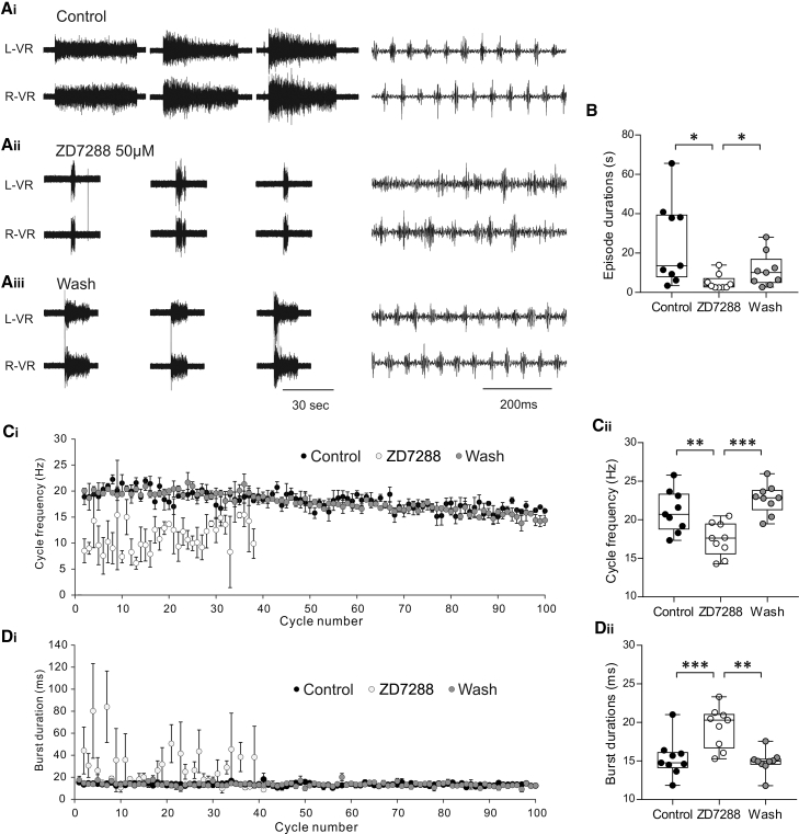 Figure 4. The Effects of ZD7288 on Xenopus Swim Network Output(A) Two simultaneously recorded raw ventral root traces on the left and right sides showing evoked swim episodes in control (Ai), in the presence of the Ih current blocker ZD7288 (50 μM; Aii), and after washout (Aiii). The right side panels show an expansion of fictive swimming activity.(B) ZD7288 (10–50 μM) significantly shortened episode duration (p = 0.026), and the effect was reversed following washout of ZD7288 (n = 9 complete experiments; p = 0.027; median with 50% IQR displayed as box-and-whisker plots).(C) Time plot showing (Ci) mean swim cycle frequency across 3 evoked episodes in control, ZD7288, and after washout. Note that the swim frequency is lower and more variable. (Cii) ZD7288 (50 μM) caused a significant decrease in cycle frequency (p = 0.0008; n = 9; median with 50% IQR displayed as box-and-whisker plots).(D) Time plot showing (Di) mean burst durations across 3 evoked episodes in control, ZD7288, and following washout. (Dii) ZD7288 (50 μM) caused a significant increase in burst duration (p = 0.0018; n = 9; median with 50% IQR displayed as box-and-whisker plots).∗p < 0.05; ∗∗p < 0.01; ∗∗∗p < 0.001. See also Figure S3.