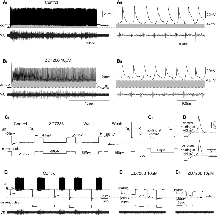 Figure 5. Blocking Ih Currents Alters dIN Firing during Swimming and Affects Rhythm Initiation(A) Example of a dIN firing during swimming.(B) In the presence of ZD7288, the tonic depolarization indicated by the gray area is larger and dINs fire at a more depolarized level. Note the different timescales in (Ai) and (Bi) and the shorter episode duration in the presence of ZD7288. The action potentials shown in (Bii) are smaller than those in (Aii). Arrow indicates a membrane hyperpolarization following the end of the swimming episode.(C) Membrane responses to (Ci) current pulses in control, in the presence of the Ih blocker ZD7288 (10 μM), and in wash. ZD7288 abolished both the sag currents and the PIR action potentials (arrow). Its effect could be partially reversed after a long wash. The post-inhibitory depolarization seen in control disappeared in the presence of ZD7288 and re-appeared during wash (arrow head). (Cii) In the presence of ZD7288, the PIR action potential could be induced when holding RMP to the control level by current injection.(D) The rebound action potential shapes in control condition and in ZD7288.(E) In some dINs (n = 3), (Ei) a single rebound action potential induced by a hyperpolarizing pulse initiated fictive swimming activity (note ventral root [VR] activity). (Eii) The property shown in (Ei) was abolished soon after ZD7288 was applied (approx. 10 min after drug application; n = 3), although PIR firing could still be evoked and the sag potential is only partially blocked. (Eiii) Later in ZD7288 treatment, both the PIR firing and the sag potential were totally abolished.