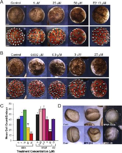 Fig. 2. BPA and BPAF disrupt cleavage divisions and neurulation at very early stages of development. A) At stage 6.5 around 4 hrs of development, control embryos (left) exhibit concise and regular mitotic cell divisions and cell membranes are clearly defined. The embryos exposed to increasing doses of BPA (A) or BPAF (B) had increasing irregular cleavage divisions, cellular dissociation, delayed development, and greatly reduced numbers of cells, which were larger in size. The bottom panels show cell counts and tracked cell borders. Estradiol-treated embryos (A, right) had some cellular dissociation, but were similar to controls (scale bar = 250 μm). C) Quantification of mean cell counts per embryo at 4 hrs show the effect of the toxicants on cleavage divisions (3–5 trials; *P < 0.05; **P < 0.005). D) Abnormal neurulation at 24 hrs was observed in about 60% of BPA-treated embryos (middle) with irregular neural folds and neural grooves (45% of embryos), incomplete and open neural tubes (10%), and extra neural tubes (5%), compared to controls (left). BPAF resulted in severely abnormal and incomplete neurulation in 95% of embryos (right).