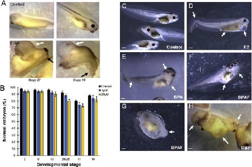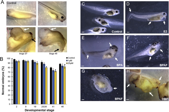 Fig. 4. Comparison of the effects of DBP, BPA, BPAF, and E2 on Xenopus tadpoles. A) Control embryos (top) developing from stage 27 to 40 compared to embryos treated with 25 µM DBP (bottom), showing malformed head and curved, shorter body axis and tail (black arrows), ventral blisters (white arrows), and overall delayed development at the corresponding times. B) The mean percent of normal embryos at various doses of DBP over the span of 96 hours (mean + SEM; 3 replicates; 300–350 embryos/treatment; *P < 0.05). C) Control embryos at 96 hrs compared to those exposed to 10 μM estradiol (D), 10 μM BPA (E), 0.03 μM BPAF (F), 0.3 μM BPAF (G), or 200 μM DBP (H) (all solutions with 0.03% ethanol). E2 caused bent tails, pigmentation reduction, long loosely coiled gut, and a ventral blister (D, arrows). BPA caused body axis defects, and shorter bent tails, head and eye defects, and occasional blisters (E, arrows). BPAF caused craniofacial defects, shorter tails, ventral blisters, edema and peritoneal effusion at the lowest doses tested (F, arrows). All embryos exposed to 200 μM DBP had severe body malformations and ventral edema (H, arrows; scale bar = 1 mm).