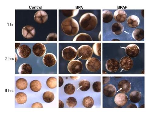 Supplemental Figure 1: Early cleavage division defects caused by BPA and BPAF. Control embryos (left column), compared to embryos exposed to BPA (50 M; middle column) or BPAF (3 M; right column) at 1, 2 and 6 hours of exposure. Irregular, asymmetrical mitotic division, slowed cytokinesis, and cellular dissociation were observed in the majority of BPA- and BPAF-treated embryos (arrows).