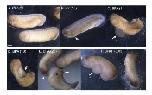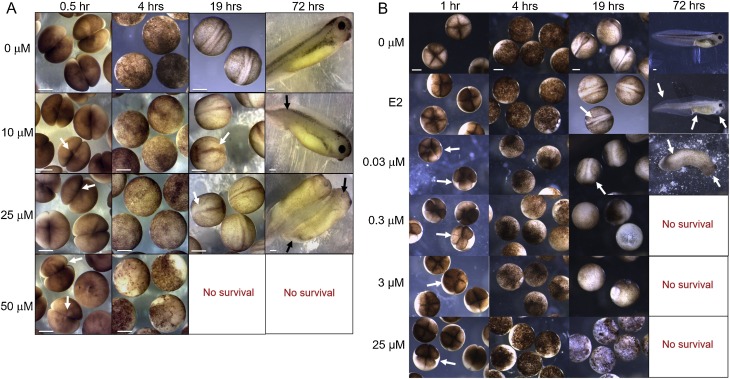 Fig. 1. The progression of developmental defects with increasing doses of BPA or BPAF. Representative embryos exposed from 0.5 hrs (2 h.p.f.) to 72 hrs, to doses of 0, 10, 25, or 50 μM BPA (A) or 0, 0.03, 0.3, 3, or 25 μM BPAF or 10 μM E2 (B). Higher doses of the chemicals resulted in increased developmental defects including irregular, asymmetrical mitotic divisions and neurulation (white arrows), truncated body axis/tail, curved spinal cord, craniofacial defects, pigment reduction, and ventral blisters and edema, along with decreased survival rates (black and white arrows; right columns; scale bar = 500 μm).