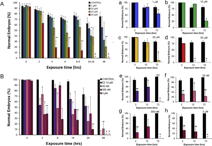 Fig. 3. Dose-dependent effects of BPA and BPAF on the number of normal surviving embryos over the span of 72 hours. The mean percentage of normally developing embryos exposed to increasing concentrations of BPA (A, a–d) or BPAF (B, e–h) compared to control embryos (black) from 0 to 72 hours. Also shown are the mean percentages of normal embryos treated with 10 μM estradiol (E2; purple) for comparison (B, e). Legends indicate the concentrations (mean + SEM; 3–7 trials; ~300–1,000 embryos/treatment; all solutions with 0.03% ethanol; *P < 0.05; **P < 0.005).