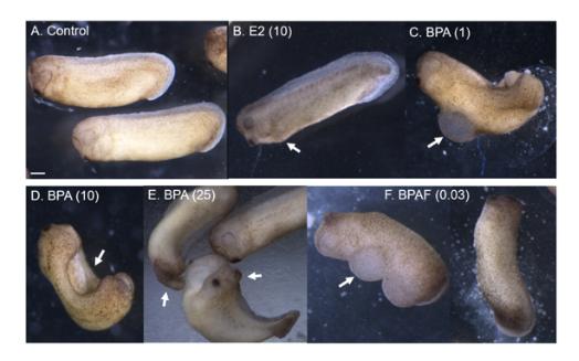 Supplemental Figure 2. : Early embryological defects caused by E2, BPA, and BPAF. A) Control tailbud stage embryos at 48 hours of development compared to tadpoles exposed to 10 M estradiol (B), BPA at 1 (C), 10 (D), and 25 M (E), and BPAF at 0.03 M (F), showing curved body axis defects, neural tube defects including two neural tubes, gut blisters, and overall extreme abnormalities (arrows; scale bar = 1 mm).