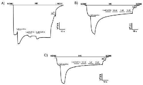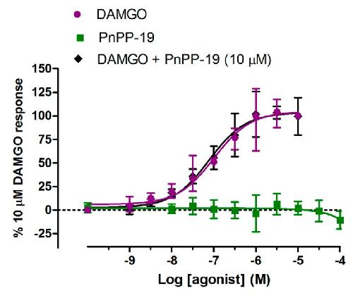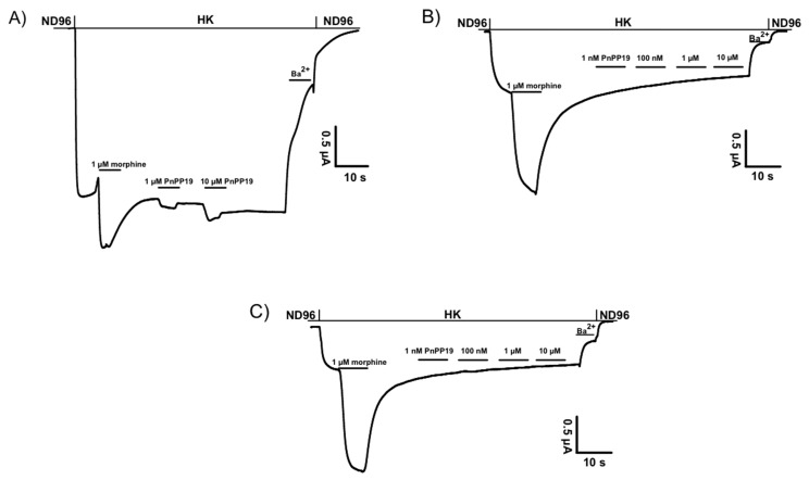 Figure 1. (A) Shows representative current traces of agonist-gated currents evoked from oocytes expressing human μ-opioid receptor (hMOR) by 1 μM morphine and 1 or 10 μM PnPP-19. PnPP-19 could not activate human δ-opioid receptor (hDOR) (B) or human κ-opioid receptor (hKOR) (C) up to a concentration of 10 μM.