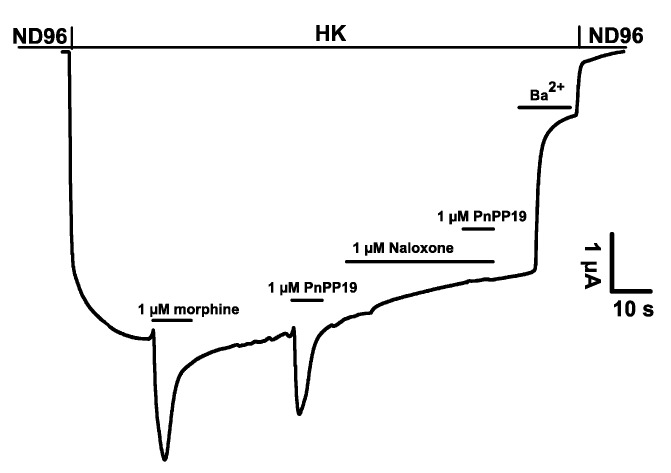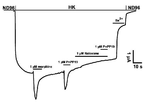 Figure 2. Representative current traces evoked from X. laevis oocytes co-expressing GIRK1/GIRK2 channels and RGS4 with hMOR. In addition, 1 μM naloxone inhibits the agonistic activity of PnPP-19.