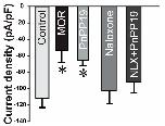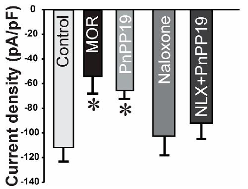 Figure 3. Effect of PnPP-19 and morphine on calcium current density evoked in dorsal root ganglion (DRG) neurons. Calcium currents were evoked by depolarizing pulses to 10 mV (200 ms) from a holding potential of â90 mV in DRG neurons incubated with 1 μM morphine, 1 μM PnPP-19 or 10 μM naloxone. Control group: cells incubated only with external/bath solution. Group NLX + PnPP-19: cells were previously incubated for 30 min with 10 μM naloxone and then PnPP-19 was added reaching a final concentration of 1 μM. MOR: morphine and NLX: naloxone. Data shown are the means ± SEM (n = 8 cells, 5 animals). * p < 0.05 compared with control (one-way ANOVA + Bonferroniâs test).