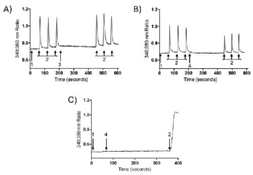 Figure 4. Representative trace showing calcium influx (changes in 340:380 nm ratios) in a single DRGneuron stimulated by KCl before and after 5 min incubation with buffer or PnPP-19. A perfusion system was used to incubate DRG neurons with buffer for 1 min (1) followed by consecutive KCl (30 mM) stimulations (2). After that, cells were perfused with buffer (3) or PnPP-19 (1 μM) (4) for 5 min, and again depolarized by KCl (30 mM) at three different time points (2). Control cells incubated only with buffer after first set of KCl stimulations do not show a significant difference in calcium influx during the second set of stimulations (A); However, cells incubated with PnPP-19 display a decrease in calcium influx during the second set of KCl stimulations (B); As a negative control, PnPP-19 does not influence calcium influx on its own (C).