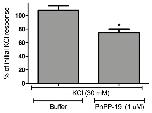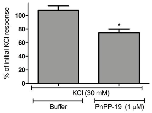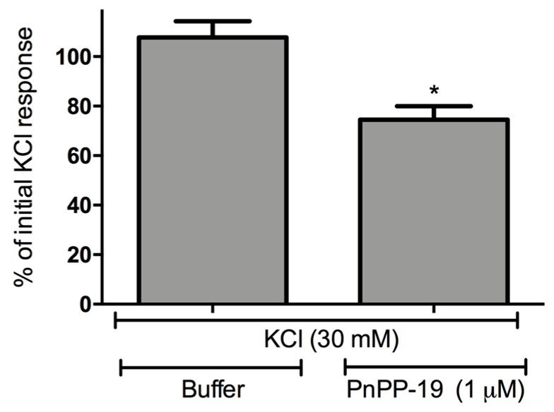 Figure 5. Effect of pre-incubation with PnPP-19 (1 μM) on KCl-evoked (30 mM) responses. The bars represent the percentage of the maximum amplitude response during the second set of KCl stimuli corresponding to the initial KCl stimulations (100%). The peak of response in each situation was calculated, and the amplitude was assessed by diminishing this value of the baseline. The baseline corresponds to the pre-incubation of cells with buffer, before any KCl stimulation. Data shown are the means ± SEM (n = 5). * p < 0.05 compared with KCl (30 mM) + Buffer (two-tailed t-test).