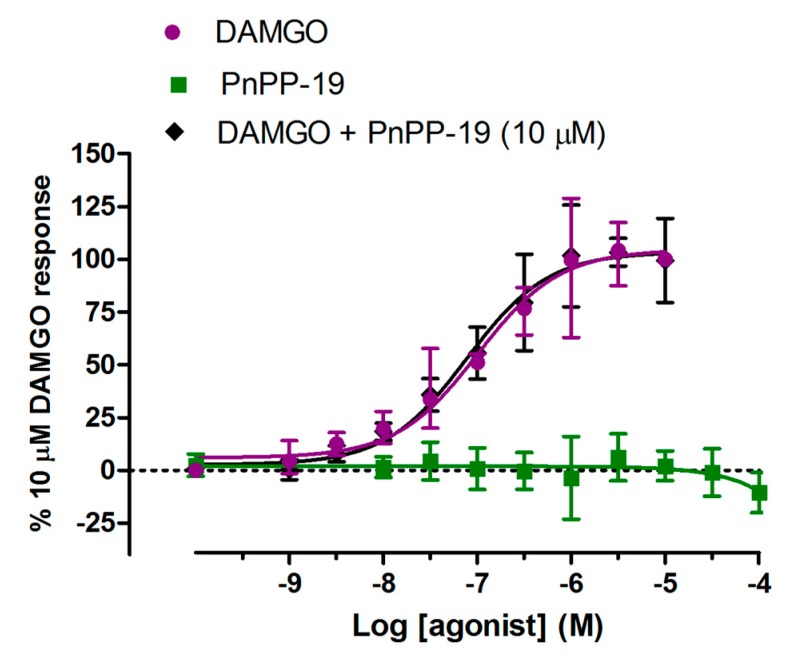 Figure 6. Recruitment of β-arrestin2 by activation of μ-opioid receptors. Stably transfected HEK293 cells coexpressing μ-opioid receptors and β-arrestin2 were pretreated for 60 min with DAMGO or PnPP-19 at the indicated concentrations. The group “DAMGO + PnPP-19” represents prior incubation of the cells with 10 μM of PnPP-19 for 30 min. β-arrestin2 recruitment was quantified by high content imaging complementation assay as described in Materials and Methods (n = 5).