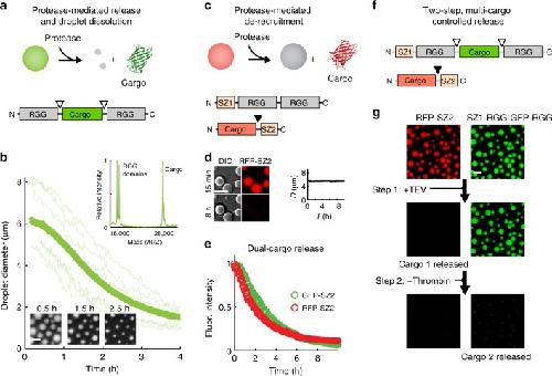 Fig. 5. Triggered cargo release from membraneless compartments. a Approach 1âprotease-mediated release of covalently attached cargo concomitant with droplet dissolution. RGG-cargo-RGG construct; cargo is flanked by thrombin protease cleavage sites. b After thrombin treatment (25ânM) of RGG-GFP-RGG, droplets shrank and released the cargo, GFP, into solution. Thick curve: average droplet diameter vs. time for >400 droplets; thin traces: individual droplet shrinking. Inset below: micrographs 0.5, 1.5, and 2.5âh after addition of protease. Insert above: MALDI-TOF shows full-length cargo (GFP), along with the single RGG domains, released upon thrombin treatment. c Approach 2âprotease-mediated release of tethered cargo; compartments remain intact. Cargo-SZ2 recruited into SZ1-RGG-RGG droplets. Cargo and SZ2 separated by TEV cut site. d Near-complete release of RFP cargo 8âh after treatment with TEV protease (0.5âμM) to remove SZ2 recruitment tag. SZ1-RGG-RGG droplets remain intact. e Kinetics of dual cargo release from droplets after TEV protease treatment to remove recruitment tag (average of >200 droplets; individual plots shown in Supplementary Fig. 5D). Cargos: GFP-SZ2 and RFP-SZ2 (1âμM each). f Two-step, multi-cargo, controlled release. Mixture of cargo2-SZ2 and SZ1-RGG-cargo1-RGG. Cargo 1 (GFP) flanked by thrombin cleavage sites; cargo 2 (RFP) and SZ2 separated by TEV cut site. g Initially, compartments contain both cargos, with colocalized green and red fluorescence. Upon treatment with TEV, RFP is released and red fluorescence is lost; protein droplets remain intact and display green fluorescence. Subsequent thrombin treatment liberates the GFP and disassembles the droplets. In all experiments, 5â10âμM RGG-RGG constructs are used. Scale bars: 10âµm |
