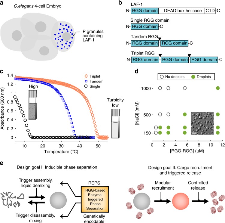 Fig. 1. Phase separation of RGG-based IDP constructs. a Illustration of four-cell C. elegans embryo. LAF-1 is present in P granules, which contribute to germline specification. b Domain organization of LAF-1, RGG, RGG-RGG, and RGG-RGG-RGG. c Representative turbidity measurements show temperature-dependent phase behavior of RGG, RGG-RGG, and RGG-RGG-RGG at protein concentrations of 0.2âmg/mL (approximately 12âμM RGG domain concentration) in 150âmM NaCl buffer, pH 7.5. d Phase diagram of RGG-RGG as a function of salt and protein concentrations. Green markers indicate conditions at which optically resolvable droplets were observed. Inset: microscopy image of phase-separated RGG-RGG protein droplets. Scale bar: 10âµm. e Schematic illustrating design goals (i) inducible phase separation and (ii) cargo recruitment and triggered release |