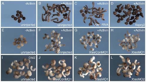from early gastrula stage 10 embryos either (I) uninjected or injected with (J) Xtes ConMO1, (K) Xtes MO1 or (L) Xtes MO2. They were cultured to the equivalent of